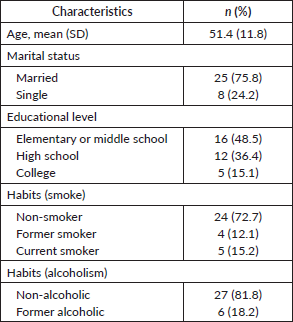 Results concerning sociodemographic and clinical characteristics from the 33 patients included in the study are described in Tables 1 and 2. The patients had a median age of 51.4 years and were mostly married (75.8%), almost half of them studied until elementary or middle school (48.5%), the majority were non-smokers (72.7%) and non-alcoholic (81.8%). Regarding patients’ clinical characteristics, almost half of them were premenopausal in diagnosis (42.4%), and most of them had a family history of cancer (60.6%).