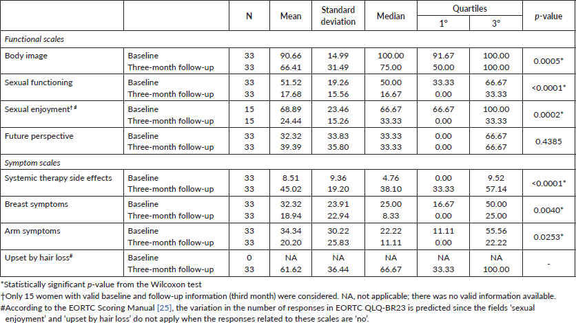 Among the women who received chemotherapy, a decrease was observed over time in breast and arm, which can be associated with the improvement and resolution of post-operative complications such as pain, function limitation of the upper limb and lymphedema. A similar result was found in the study by Winters et al [24], whose patients also reported improvements in locoregional symptoms over time. Moreover, there were no differences between the periods in cognitive functioning, pain, dyspnoea, constipation, financial difficulties and future perspective between the two evaluations.