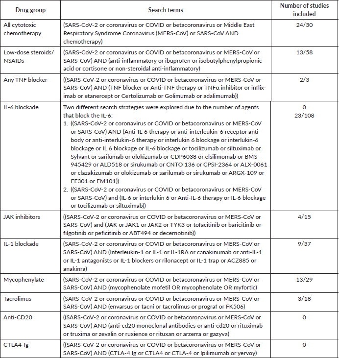 Results: 89 studies were included. Cytotoxic chemotherapy has been shown to be a specific inhibitor for severe acute respiratory syndrome coronavirus in in vitro studies, but no specific studies exist as of yet for COVID-19. No conclusive evidence for or against the use of non-steroidal anti-inflammatory drugs (NSAIDs) in the treatment of COVID-19 patients is available, nor is there evidence indicating that TNFα blockade is harmful to patients in the context of COVID-19. COVID-19 has been observed to induce a pro-inflammatory cytokine generation and secretion of cytokines, such as IL-6, but there is no evidence of the beneficial impact of IL-6 inhibitors on the modulation of COVID-19. Although there are potential targets in the JAK-STAT pathway that can be manipulated in treatment for coronaviruses and it is evident that IL-1 is elevated in patients with a coronavirus, there is currently no evidence for a role of these drugs in treatment of COVID-19.