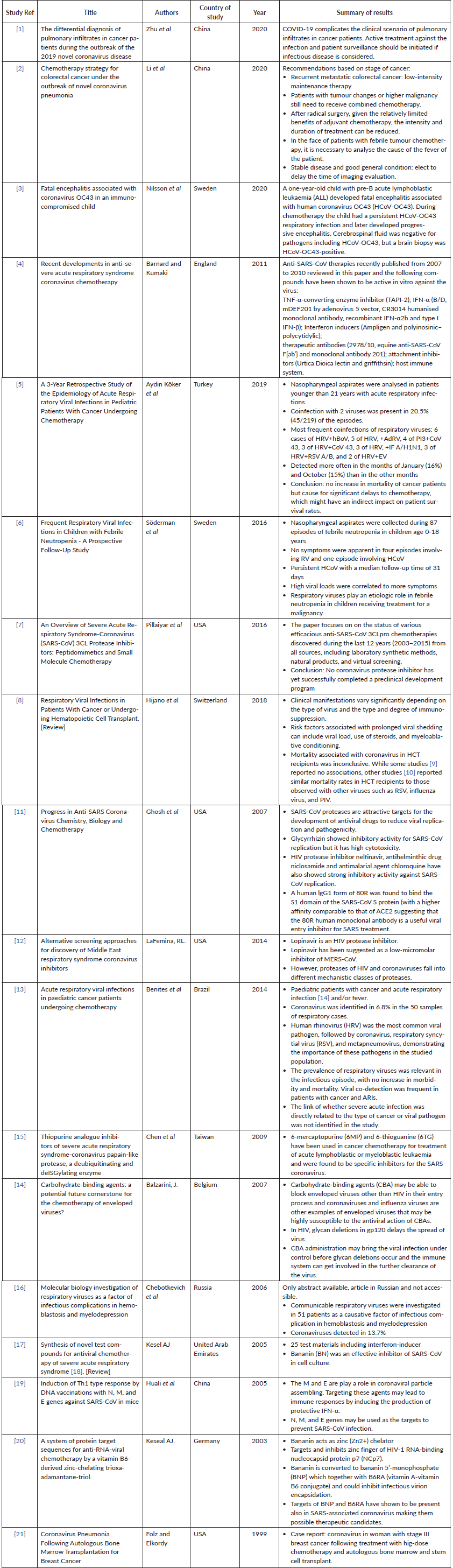• A case of a young woman with stage IIIA breast cancer from 1999 reported that diagnosis of coronavirus following treatment for cancer using a high-dose chemotherapy regimen and autologous bone marrow and stem cell transplantation. The electron microscopy revealed coronavirus pneumonia [6]. Coronavirus should be potentially considered in the differential diagnoses of respiratory failure in patients who have undergone high-dose chemotherapy and autologous bone marrow transplantation.
