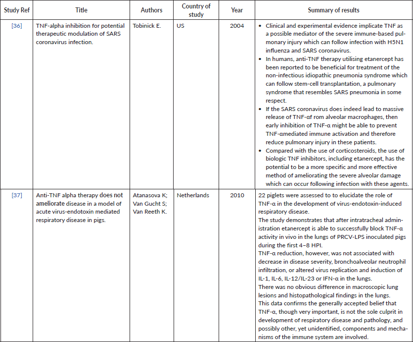 A total of three studies were identified, of which two were deemed suitable for inclusion (Supplementary Table 3). The first study was a research letter that suggested that TNFa has been implicated in the severe immune-based pulmonary injury caused by SARS coronavirus, suggesting that TNFa inhibitors could be a potential treatment for the acute respiratory disease syndrome caused by coronavirus [21]