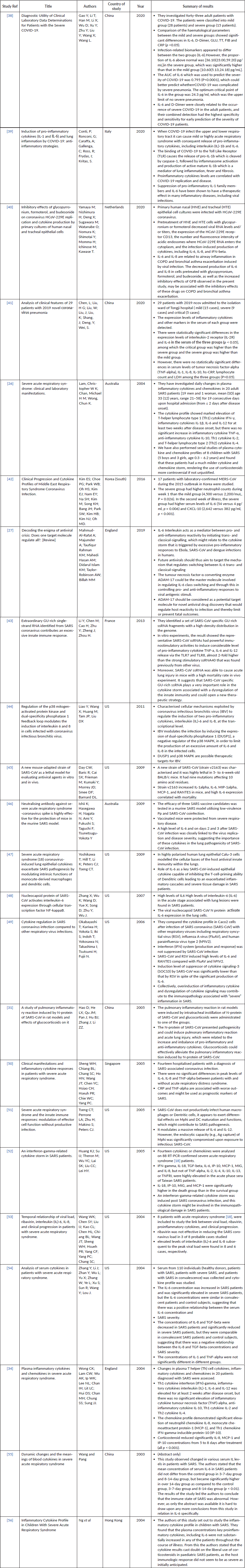 • A cytokine profiling was performed for 110 serum from healthy donors, patients with SARS, patients with severe SARS, and patients with SARS in convalescence. IL6 concentrations were significantly elevated in severe SARS patients, but the IL-6 concentrations were similar in convalescent patients and control subjects which suggested that IL6 is associated with SARS severity [38].
