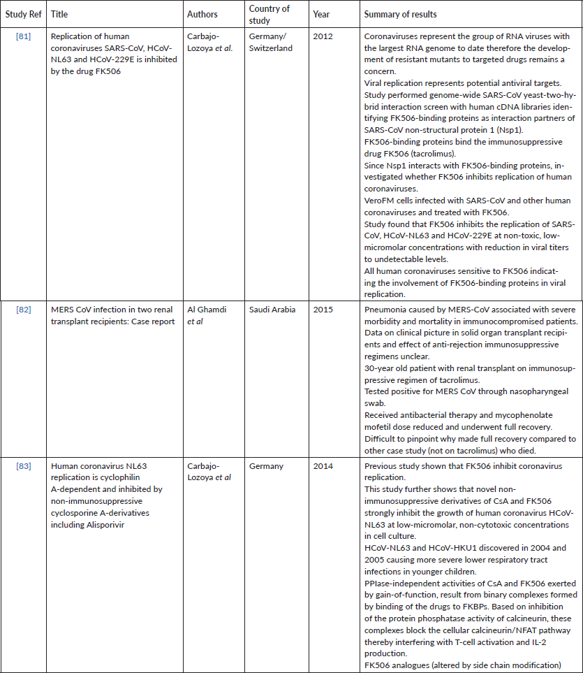 Supplementary Table 8. Current studies investigating COVID-19/ other coronavirus strains and Tacrolimus.