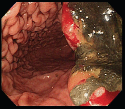 Figure 2. A giant gastric ulcer over lesser curvature of stomach (right half of the figure) revealed by upper gastrointestinal tract endoscopy.