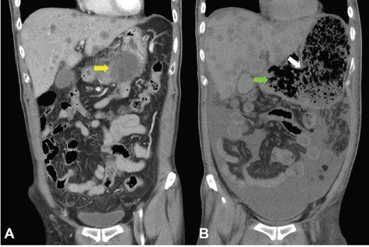 Figure 8. CT scan of the abdomen, coronal view. A. June 8, 2019. Yellow arrow: the huge gastric tumour. B. July 3, 2019. Green arrow: Necrotising tumour lysis simulating emphysematous pancreatitis.