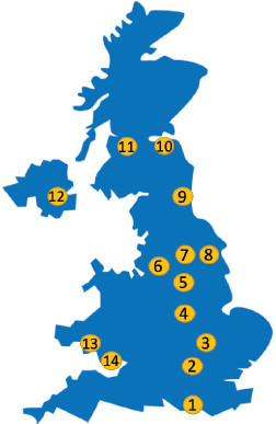 Figure 1. Geographic representation of key services and projects. 1—Brighton (Sussex Cancer Centre—Brighton and Sussex University Hospitals NHS Trust). 2—London (Guy’s and St. Thomas’ NHS Foundation Trust, University College London Hospitals NHS Foundation Trust). 3—Cambridge (Cambridge University Hospitals NHS Foundation Trust). 4—Nottingham (Nottingham University Hospitals NHS Trust). 5—Sheffield (Sheffield Teaching Hospitals NHS Foundation Trust). 6—Manchester (The Christie NHS Foundation Trust; Manchester University NHS Foundation Trust). 7—Leeds (Leeds Teaching Hospitals NHS Trust). 8—Hull (Queen’s Centre for Oncology and Haematology—Hull University Teaching Hospitals NHS Trust). 9—Newcastle upon Tyne (Newcastle upon Tyne Hospitals NHS Foundation Trust). 10—Dundee (Ninewells Hospital—NHS Tayside). 11—Glasgow (Beatson West of Scotland Cancer Centre). 12—Belfast (Belfast Health and Social Care Trust—NHS Greater Glasgow and Clyde). 13—Swansea (South West Wales Cancer Centre, Swansea Bay University Health Board). 14—Cardiff (Cardiff and Vale University Health Board).