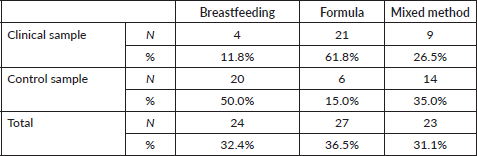 Results showed that women in the clinical group breastfeed significantly less and use formula more than those in the control group. Moreover, in the clinical group, women who breastfeed feel reported higher levels of confusion (according to POMS) than mothers who bottle-feed or use a mixed feeding method. On the contrary, in the control sample, women who breastfeed feel significantly more vigorous than puerperae who bottle-feed or use mixed methods according to POMS.