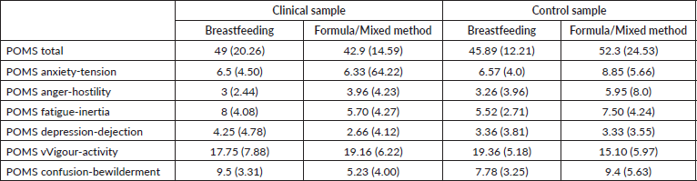Table 3. Mean (SD) of POMS total score and subscales in clinical and control sample related to feeding method.