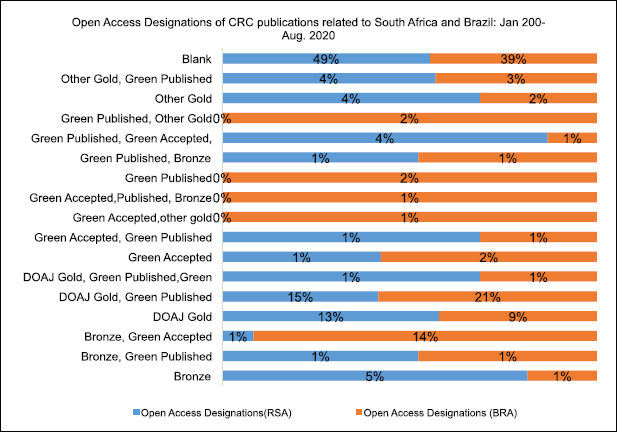 Figure 9. Open access esignations between publications related to SA and BRA: Jan. 200–Aug. 2020.