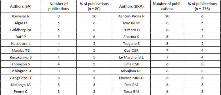 Table 1 outlines the top four authors and the number of publications produced on CRC related to SA and BRA by each author. Only one author was included in eight (10%) publications on CRC related to SA. Three authors were included in five (6%) publications; four authors were included in four (5%) publications and four authors were included in three (4%) publications.
