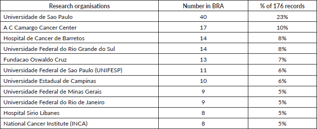 Similarly, in BRA, the first three research organisations were University of Sao Paulo (23%), A C Camargo Cancer Centre (10%) and Hospital de Cancer De Barretos (8%).