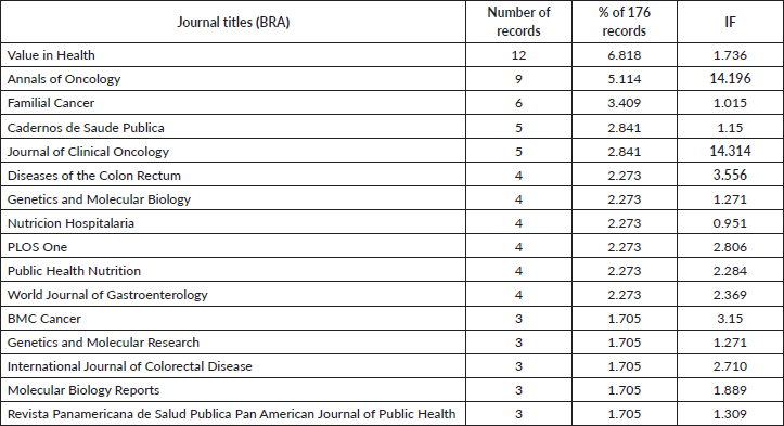 The majority of journals had published only one article on CRC research related to BRA. The top seven journals with highest IF were Lancet Oncology (IF = 23.296); Clinical Oncology (IF = 18.230); Oncology (IF = 15.389); Journal of National Cancer Institute (IF = 15.271); Lancet Gastroenterology and Hepatology (IF = 14.789); Journal of Clinical Oncology (IF = 14.314) and Annals of Oncology (IF = 14.196).