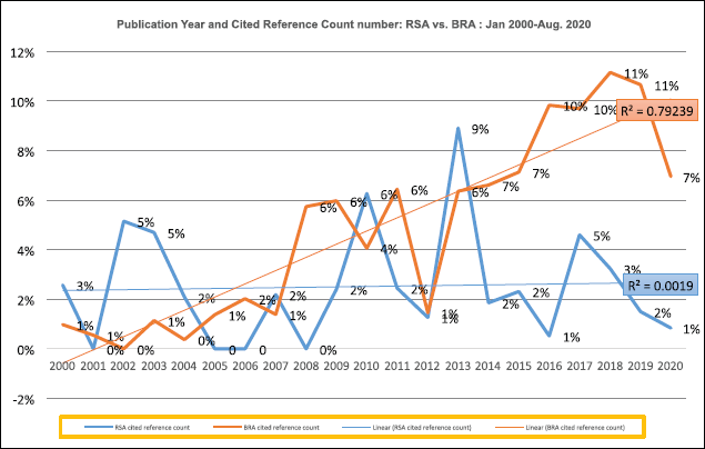 Figure 7. Publication year and cited reference count number: SA versus BRA: Jan. 2000–Aug. 2020.