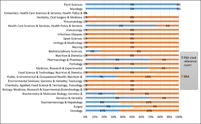 Medicine, Research & Experimental and Biochemistry & Molecular Biology were at 4% while Genetics & Heredity (3%) was the next WoS category with most cited reference count for publications related to SA. Other WoS categories with cited reference count for publications related to BRA included Biochemistry & Molecular Biology (9%); Nutrition & Dietetics (8%) and Multidisciplinary Sciences (6%).