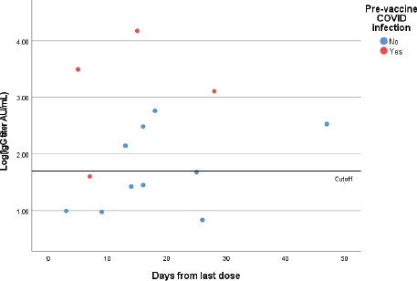 Out of 14 patients who have received only one dose of the vaccine, 7 had negative IgG results (seroconversion rate following one dose is 50%). Six out of these 7 patients had no previous COVID-19 infection and only one a prior infection (Figure 1).