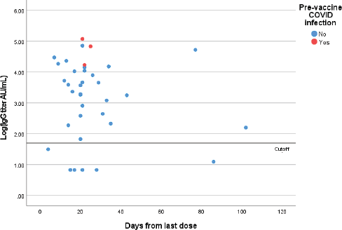 Figure 1. Quantitative IgG titers (logarithmic scale) for patients who received one dose of the vaccine. Each point represents one patient.