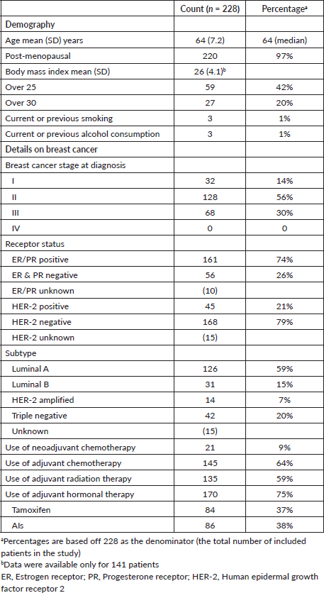 The mean (SD) age of our cohort of 228 women was 63.9 (7.2) years, and 21.5% (n = 49) were older than 70 years. The majority of the patients (96%) were post-menopausal. The mean (SD) BMI was 26 (4.1) with 61% either being overweight (BMI > 25) or obese (BMI > 30) [18]. There were very low rates of smoking (1%, n = 3) and alcohol consumption (1%, n = 3) in this cohort. Most patients had Stage II (56%) or Stage III (30%) breast cancer; none had Stage IV disease. Most patients had received adjuvant chemotherapy (64%) and radiation therapy (59%). Two-thirds of patients (75%) were on adjuvant hormonal therapy (Table 1).