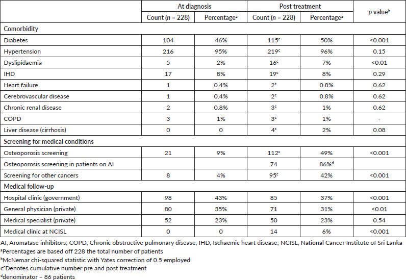 Conclusions: Hypertension was the most prevalent comorbidity while type 2 diabetes and dyslipidaemia were the most common diagnoses post-treatment. In these patients, screening for osteoporosis and other cancers remains very low, emphasising a missed opportunity.