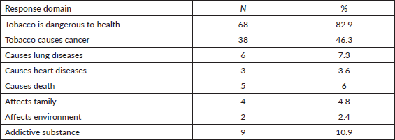 A majority (82.9%; N = 68) of the participants felt that ‘Tobacco is dangerous to health’ while 4.8% and 2.4% of the participants considered that tobacco affects family and environment (Table 1).