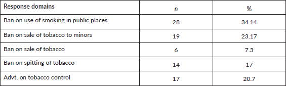 When enquired in detail regarding the perceived challenges in the implementation of tobacco-related legislations (Table 2); 31.7% (N = 26) of the respondents considered the lack of strict tobacco control laws and punishment strategies to be responsible for the complacent attitude amongst the masses.
