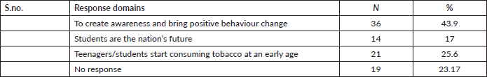 Most of the study respondents (89%; N = 73) suggested that various tobacco-related strategies should be dissipated at the school level only. They were further enquired the reason behind this (Table 3); wherein 43.9% (n = 36) considered it optimum to increase awareness and bring positive behaviour change during the early phase of life.