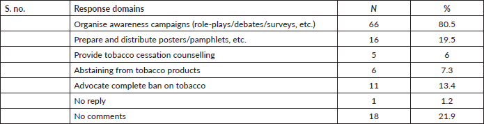 Students were further probed to suggest possible ways through which they can actively contribute towards tobacco control strategies (Table 4). Most (80.5%; N = 66) of the participants were interested in organising tobacco awareness camps at the local level.