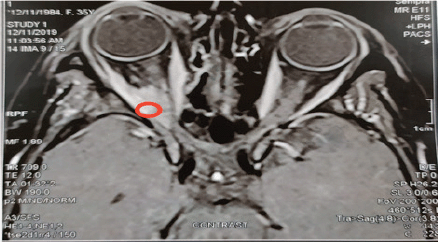 Figure 1. MRI brain at dignosis: T1 with contrast shows right superior rectal muscle thickening about 14 mm associated with slight proptosis of the right eye.
