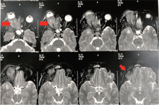 Figure 2. MRI brain and orbit showed significant increase in the previously described right recti muscles thickness with heterogeneous post-contrast enhancement. There is subsequent proptosis and posterior ocular coat mass lesion just above the optic disc with significant enhancement of all posterior ocular coats. There is extra-orbital spread, and intra-cranial extra-axial leptomeningeal enhancement at the right frontotemporal region.