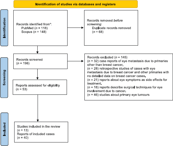 A PubMed and Scopus search including English language only was performed using the Med search words ‘breast cancer’, ‘eye metastasis’ and/or ‘orbital metastasis’ until January 2021. The literature search revealed 53 records, of which 13 were included in the review and 40 in the quantitative analysis (Figure 4) with 94 cases collectively which were included in the analysis (Supplementary Table 1).