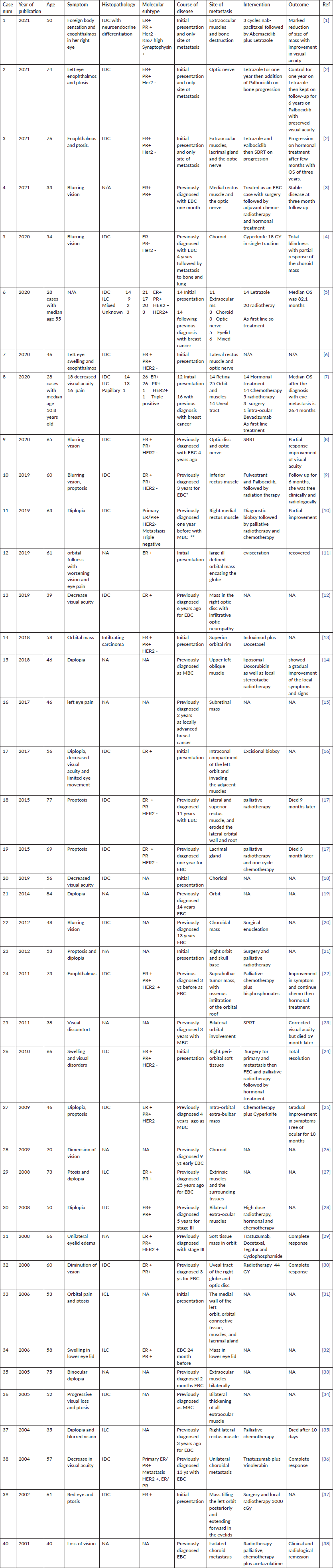 Supplementary Table 1. Summary of cases reported on the literature on eye metastasis of breast cancer origin.