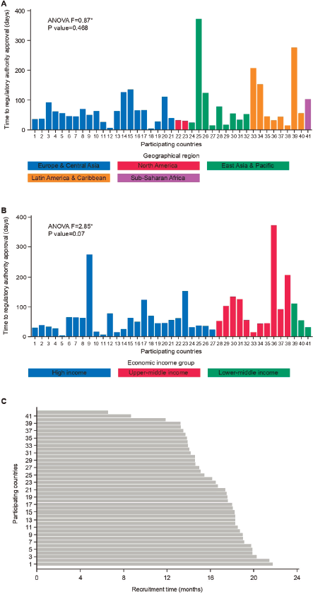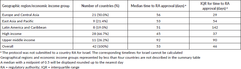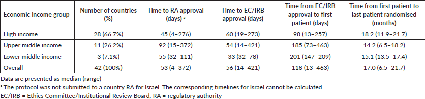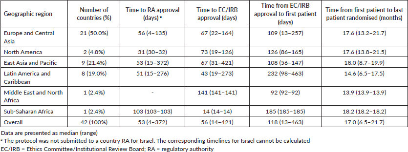 Results: Forty-one countries (of 42) had data available regarding all relevant timelines. No statistical difference was observed between the time to RAA and geographical region (p = 0.47), although there was a trend to longer time to RAA in upper middle-income economies (p = 0.07). Except for time from first to last patient randomised, there was wide variation in timelines overall and within geographical regions and economic income groups.