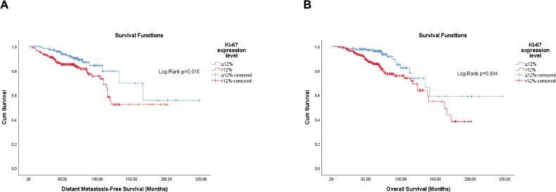 Figure 1. Cumulative survival curves by the KM estimator according to the Ki-67 expression level in luminal breast cancer patients (n = 448). (a): DMFS. (b): OS.