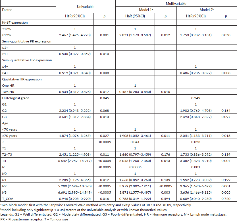 For OS, the stepwise model included both Ki-67 and qualitative expression of HR as significant (Table 4). Due to strong to very strong correlations between semi-quantitative PR expression and cHR (Spearman’s rho: 0.802, p < 0.005); semi-quantitative PR expression and qualitative HR expression (Spearman’s rho:0.553, p < 0.005); and between cHR and qualitative HR expression (Spearman’s rho: 0.667, p < 0.005), the second model included the factor with the lowest p-value (cHR), which resulted in being significant after covariation (Table 4); the analysis including semi-quantitative PR expression showed significance after covariation (adjusted HaR: 0.465 (0.276–0.781), p = 0.004) and Ki-67 expression (adjusted HaR: 1.803 (1.012–3.210), p = 0.045).