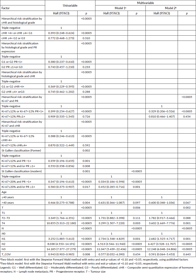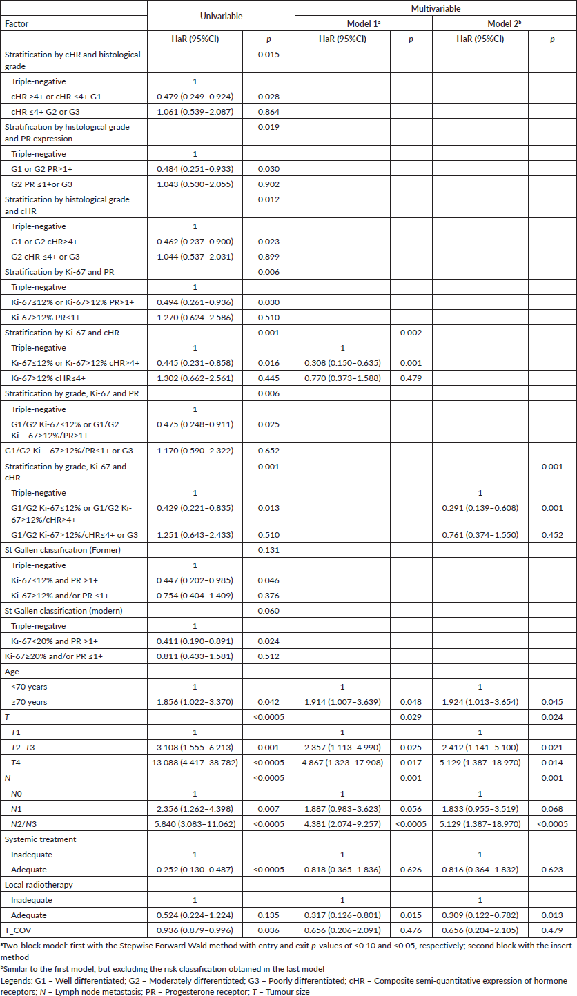 Previous analyses resulted in the inclusion of different factors according to outcomes. However, histological grade and Ki-67 proliferative index are known risk factors in patients with luminal breast cancer. Aiming at a greater segregation of risks, stratified (hierarchical) analyses were carried out to study the effect of modification by other variables. As the semi-quantitative expressions of PR and cHR were independent variables for both outcomes, the hierarchy started with them.