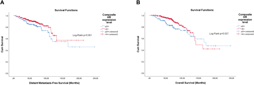 Figure 3. Cumulative survival curves by the KM estimator according to the cHR in luminal breast cancer patients (n = 448). (a): DMFS. (b): OS. Legend: cHR – Composite semi-quantitative expression of hormone receptors.