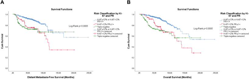 Although with a moderately strong correlation (Spearman’s rho: 0.398, p < 0.005) and association (Pearson’s χ2: 176.768, p < 0.005) between ER and PR, the semi-quantitative expression of ER was not significant for any outcome.