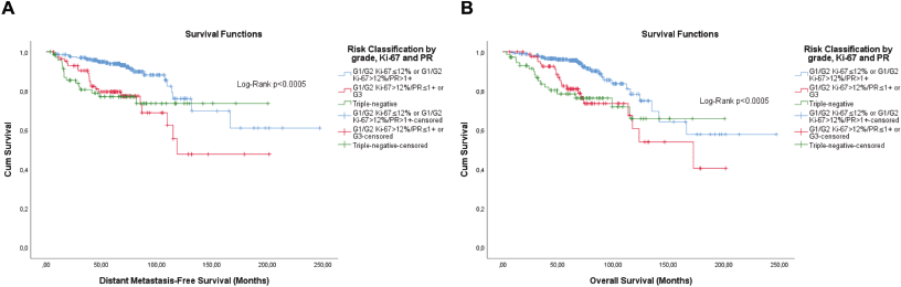 Results: During a median observation of 5.5 years, 105 distant metastasis events and 105 all-cause deaths were observed. In addition to known clinicopathological factors (i.e., age, tumour size and lymph node metastasis), the high semi-quantitative expression of both hormone receptors was associated with distant metastasis-free survival (DMFS) (adjusted hazard ratio (HaR): 0.524 (0.316–0.867), p = 0.012) and overall survival (OS) (adjusted HaR: 0.486 (0.286–0.827), p = 0.008). The stratified analysis made it possible to identify risk modification factors. Subsequent stratification by histological grade, Ki-67 and semi-quantitative PR expression or, mainly, the composite semi-quantitative expression of hormone receptors (cHR) enabled the identification of luminal breast cancer patients of adjuvant schema at higher risk for metastasis and death. However, initial analyses including patients of neoadjuvant therapy pointed to a path of subsequent stratification by cHR and histological grade, also enabling grouping of luminal breast cancer patients with similar prognosis for DMFS (cHR ≤ 4+ G2 or G3 versus triple-negative, adjusted HaR: 0.703 (0.415–1.189), p = 0.189) and OS (cHR ≤4+ G2 or G3 versus triple-negative, adjusted HaR: 0.662 (0.403–1.088), p = 0.104).