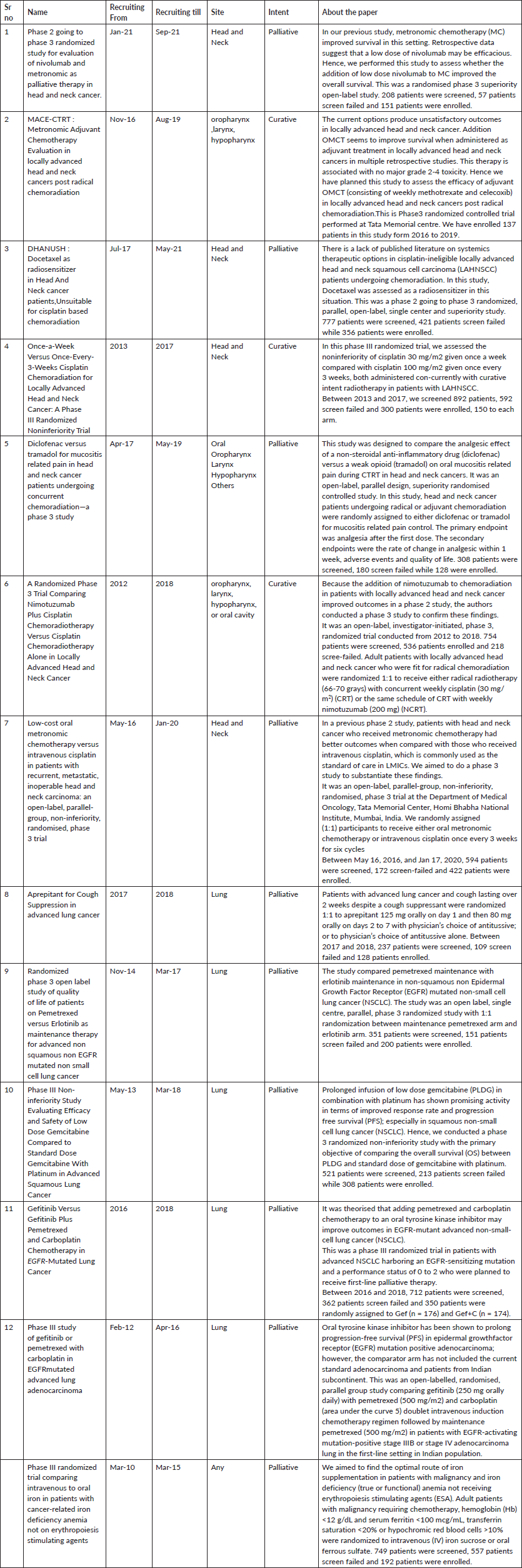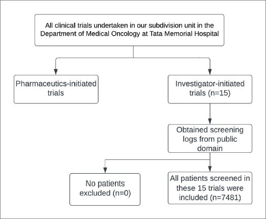 Methods: This was an audit of 15 randomised studies performed by medical oncology solid tumour unit II of Tata Memorial Centre. The screening logs of these studies were acquired. From the screening logs, data regarding the number of patients who had screen failed & reason for the same were obtained. Descriptive statistics were performed.