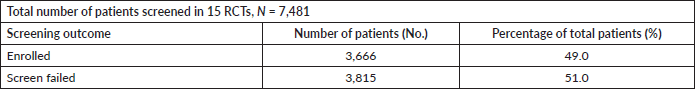 Table 1. Number of patients for each screening outcome of the total screened patients from 15 RCTs. RCT, Randomised controlled trial.