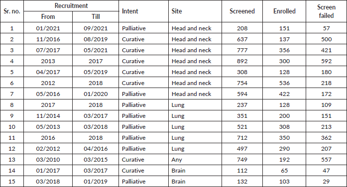 A total 7,481 patients were screened for 15 randomised clinical studies. Out of these, 3,666 (49.0%) patients were enrolled into trial and 3,815 (51.0%) screen failed (Table 1). Details of recruitment, intent and targeted site for each of the 15 studies are given in Table 2. Further details including the title as well as a ‘key points’ summary of each of these trials is included in Table S1 in the Supplementary Appendix. Total, enrolled and screenfailed patients by therapeutic site of trial and by intent of trial are depicted in Table 3 and 4 respectively. The most common reason for screen failure was non-meeting inclusion criteria (54.9%) followed by declining to take treatment (22.2%). These were followed by ‘Other’ (6.4%) which included reasons like taking a certain treatment at a different hospital or death before being able to complete screening. Not willing to stay at locality of trial site (6.2%), recruited in other study (3.7%) and poor performance status (PS) were the other significant causes for screen failure listed in order of magnitude. The full list of causes for screen failure is listed in Table 5 and in Figure 2.