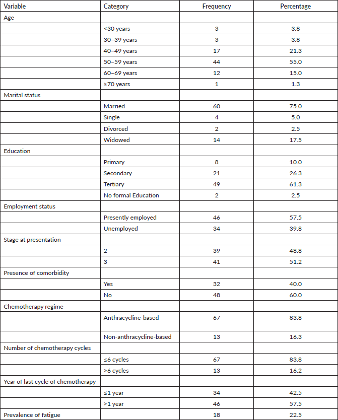 Materials and methods: This is a cross-sectional study involving 80 BCS attending the radiation oncology University College Hospital Ibadan. Their sociodemographic, disease and treatment characteristics were obtained. Fatigue Symptom Inventory was used to assess fatigue. A score of at least 3 on average fatigue severity item was taken as cut-off for clinically meaningful fatigue.