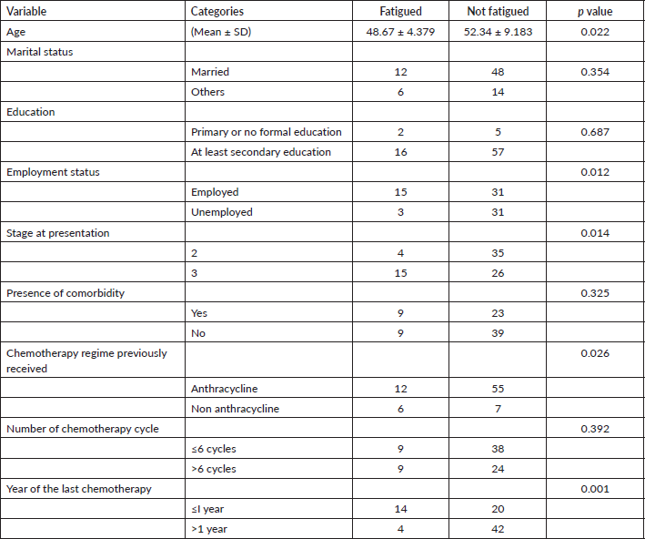 Table 2 shows sociodemographic and treatment-related correlates of fatigue in BCS. The mean age of BCS that experienced fatigue was significantly lower than those who did not (p = 0.022). Level of education was not associated with fatigue in these studies (p = 0.354). Patients that were employed however reported significantly higher fatigue (p = 0.012). Late stage of presentation (p = 0.014), previously receiving anthracycline chemotherapy (p = 0.026) and last year of chemotherapy within 1 year (p = 0.001) were associated with the occurrence of fatigue in BCS. The number of cycles received was however not significantly related with fatigue (p = 0.392) (Table 2).