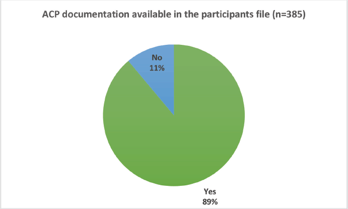 Of the 387 participants, we found that 88.9% had evidence of documentation of ACP discussions in their files (Figure 1); these were in the form of the Clinical Navigation tools and doctors’ documentation of family conference discussions.