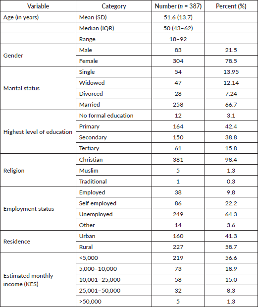 The average age of the study participants was 51.6 (SD ± 13.7) years. The majority were females, 78.5% (304/387); more than half (58.7%) resided in rural areas. Only 61(16.5%) had a tertiary level of education and 381 (98%) were Christians; 249 (64.3%) were unemployed Table 1.