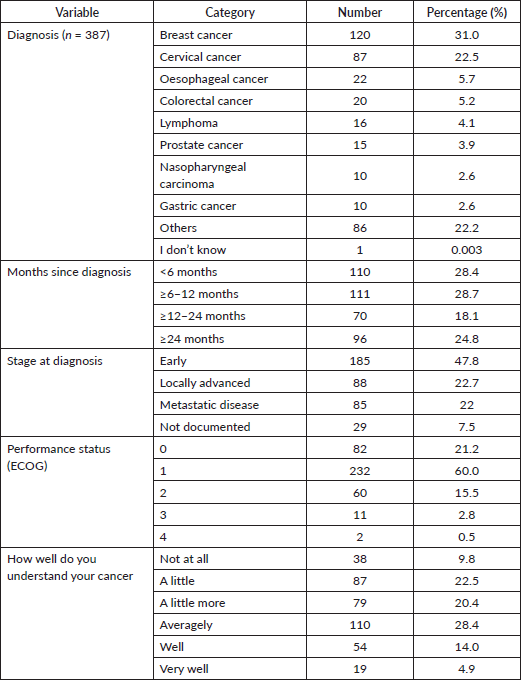Methodology: A descriptive cross-sectional survey was conducted at the ambulatory oncology clinic at a tertiary referral hospital. We recruited 387 study participants through consecutive sampling among heterogenous cancer patients. An interviewer-administered questionnaire was used to collect data, which was analysed by SPSS version 25 and through multivariable logistical regression.