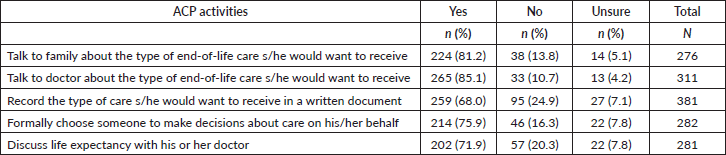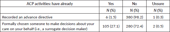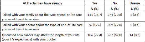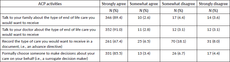 Overall, 105 (27.1%) of the participants had appointed a surrogate decision maker, while only 6 (1.5%) had documented their end-of-life wishes in a written document (an advance directive) (Table 3). Table 4 depicts Self-reported participation in ACP activities. Altogether, 111 participants (28.7%) had already discussed the type of end-of-life care they would want to receive with their family; however, only 19.6% had discussed this with their doctor. In total, 200 participants (51.7%) had not participated in any ACP activity.