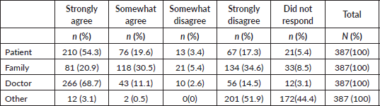 Table 6 depicts participants’ willingness to participate in ACP activities. Among participants who had not participated in each ACP activity, 81.2% wanted to talk to their family about the type of end-of-life care they wanted to receive. Fewer participants (68%) wanted to record the type of end-of-life care in an advance directive. On whom was most suited to initiate ACP discussions, 70.9% of study participants who responded strongly agreed that the doctor should initiate ACP discussions, while 57.4% of respondents strongly agreed that the patient was best suited to initiate ACP discussions (Table 7).