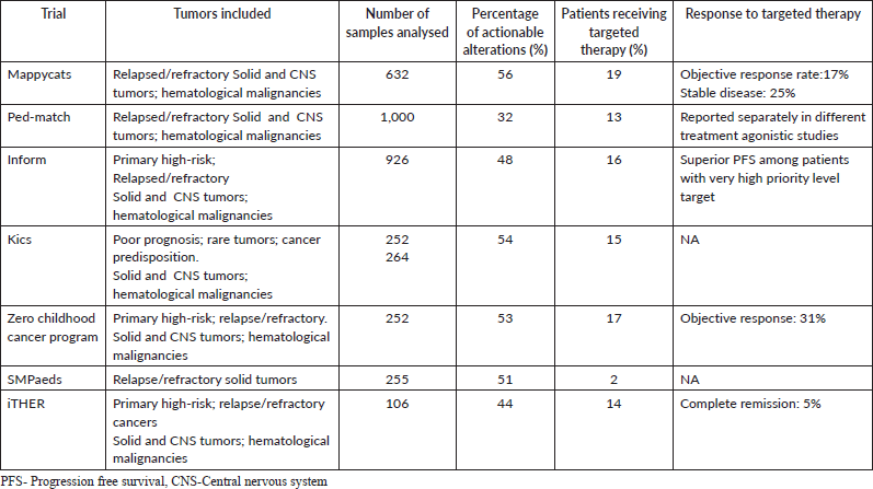 Studies such as the NCI-COG Pediatric MATCH trial have laid the foundation for the broader application of precision medicine in pediatric oncology [36]. This trial established a collaborative framework for efficiently collecting, processing and sequencing refractory pediatric cancers. Early results revealed actionable alterations in 31.5% of the first 1,000 tumours screened. Similarly, the European MoleculAr profiling for pediatric and young adult cancer treatment stratification (MAPPYACTS) trial identified potentially actionable targets in 69% of 624 patients screened [37]. Beyond identifying actionable mutations, these studies have unveiled other critical benefits. Germline mutations were detected in 7%–17% of enrolled patients, offering insights into hereditary cancer predisposition with significant implications for family members [38]. Molecular profiling has also occasionally led to changes in diagnosis, enhancing the precision of therapeutic strategies [39]. Once actionable targets are identified, patients can be enrolled in platform trials targeting specific survival pathways or have their cases reviewed in multidisciplinary tumour boards (MTBs). MTBs provide age-specific therapeutic recommendations, ensuring safety and efficacy for pediatric patients. Table 2 lists the Published pediatric precision medicine studies.