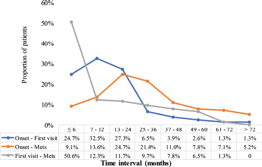 Figure 5. Duration of development of distant metastasis. Mets: distant metastasis. Blue line: ‘Onset – First visit’ – represents the time interval between the appearance of initial symptoms and patients’ first visit to the radiotherapy and oncology centre. Orange line: ‘Onset – Mets’ – represents the time interval between the initial onset of symptoms and the first confirmed diagnosis of distant metastasis. Grey line: ‘First visit – Mets’ – indicates the time interval between patients’ initial visit to the radiotherapy and oncology centre and the diagnosis of distant metastasis.