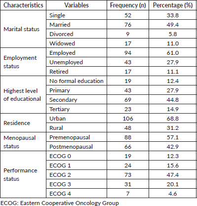 A considerable majority (61%) was employed whereas 27.9% were unemployed (Table 1). In all, 14.9% attained tertiary education whereas 12.4% were not formally educated. Most (68.8%) were urban dwellers whereas 31.2% resided in rural areas. Premenopausal women comprised 57.1% whereas postmenopausal women accounted for 42.9%. Some of the participants had a good performance status of ECOG 0 (12.3%) or ECOG 1 (15.6%) whereas close to half (47.4%) were classified as ECOG 2. Also, 20.1% were ECOG 3 whereas 4.6% were moribund with ECOG 4 performance status.
